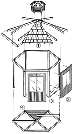 さわやかな日陰で庭のパノラマを楽しむ毎日がはじまります。 デッキ(8ピース)、手摺りフェンス(7set)、屋根(8ピース)は、 あらかじめパネルになっています |